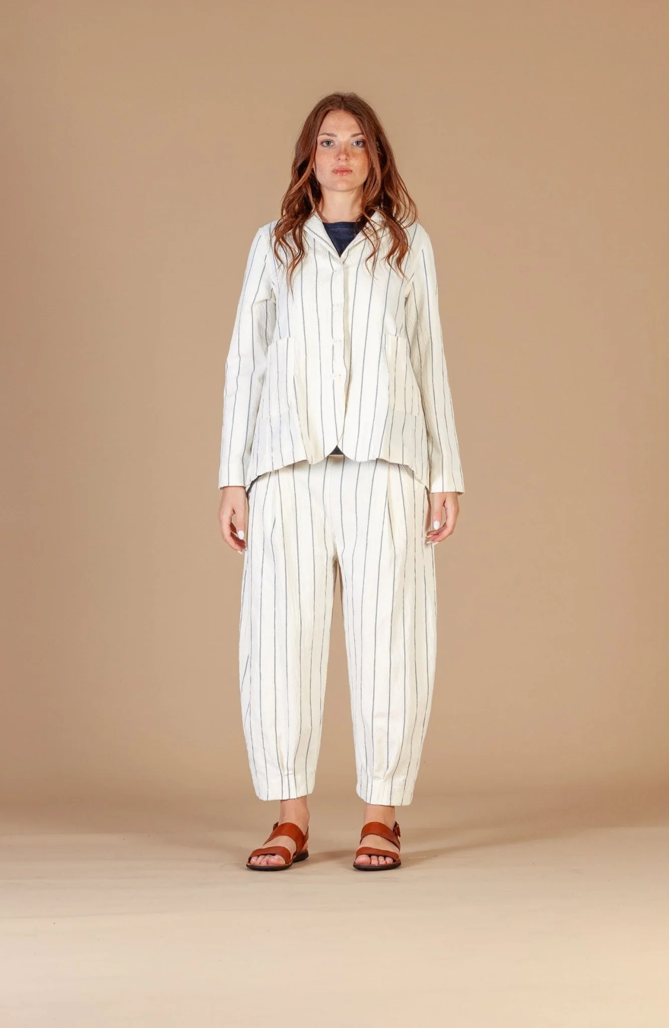 Relaxed tailoring meets playful detail in these Mama b Bianco trousers. Cut in a soft ecru with contrasting blue stripes, they feature a gently curved bubble silhouette that's both comfortable and contemporary. The regular fit works effortlessly with everything from crisp shirts to oversized knits, making them a versatile wardrobe staple for everyday wear.